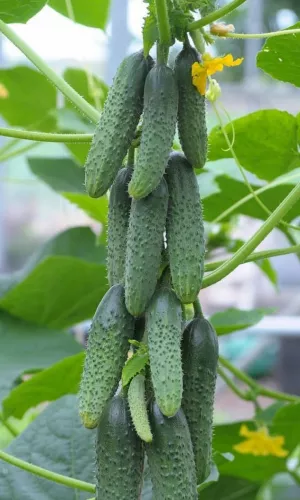 Стабильное плодоношение при любых условиях выращивания. Раннеспелый партенокарпический гибрид женского типа цветения. Для плёночных теплиц и открытого грунта. Период от всходов до сбора урожая 38-42 дня. Растение сильнорослое, ветвление слабое. Боковые побеги преимущественно с ограниченным типом роста. Плоды цилиндрические, белошипые, крупнобугорчатые, длиной 12-14 см, диаметром 3,5-4,5 см. Масса 120-150 г. Устойчив к вирусу огуречной мозаики, оливковой пятнистости и толерантен к мучнистой росе и пероноспорозу.